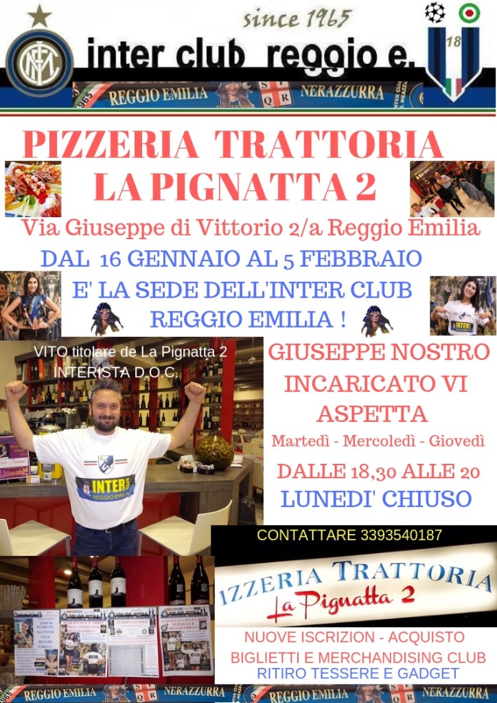 LA PIZZERIA TRATTORIA LA PIGNATTA 2 E’ LA SEDE DELL’INTER CLUB REGGIO EMILIA DAL 16 GENNAIO AL 5 FEBBRAIO COMPRESO!