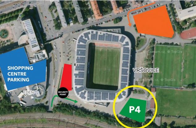 Parcheggio settore ospiti: nei pressi del Sinobo Stadium si trova un parcheggio dedicato solo ai pullman e alle macchine dei tifosi ospiti. Il parcheggio si trova a sud-est dello stadio ed è a pochi metri dall’entrata del settore ospiti. Si può accedere al parcheggio passando attraverso ad un controllo di sicurezza, la capienza è di 5 pullman e circa 60 macchine. Il prezzo del parcheggio per tutta la giornata è di 500 CZK per i bus e di 300 CZK per le auto.