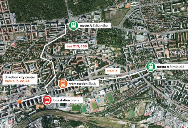 In Tram: dal centro della città si possono prendere i tram 6, 7, 22 o 24 e si scende alla fermata SLAVIA (sono circa 10 fermate, il tragitto dura circa 15/20 min). In Autobus: le linee 135, 136, 150 e 213 collegano il Sinobo Stadium con la linea A (fermate: Náměstí Míru, Flora, Želivského). In Taxi: per le corse in taxi il prezzo per chilometro è di circa 20/25 CZK a cui si aggiungono 40 CZK di tariffa standard. Fra il centro-città e lo stadio ci sono circa 5km quindi il costo di un taxi dal centro è di circa 150-200 CZK. I trasporti pubblici sono attivi dalle 5 del mattino fino a mezzanotte, tutti gli orari, le linee e le informazioni sono disponibili sul sito: http://www.dpp.cz/en/.