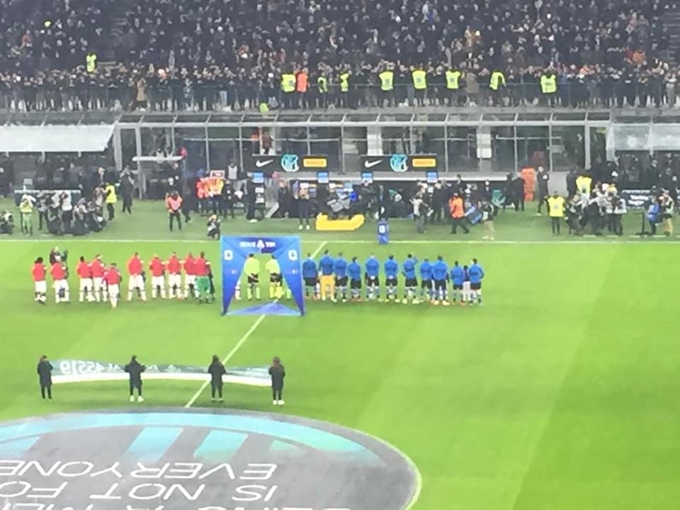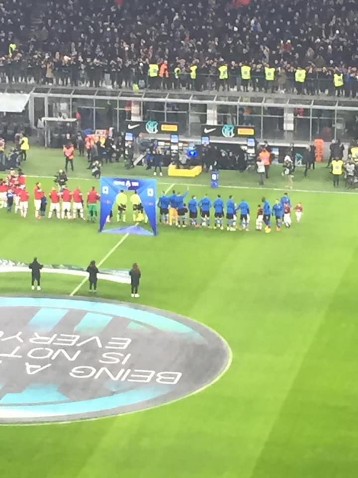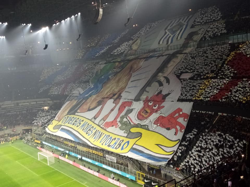 Gli ultrà milanisti, nel pre match, quando lo stadio era nella penombra illuminato solo dal bel gioco di led nerazzurri, hanno composto con la luce dei cellulari un poetico “Inter m…a”. Nei derby non si era mai caduti così in basso. Insulti vocali se ne sono sempre sentiti a volontà, ma nessuna delle due fazioni era ricorsa all’insulto riportato chiaro per iscritto in una coreografia. Sempre più in basso i cugini, in classifica tanto che nell’etica sportiva. Di ben altro stile lo striscione srotolato, assieme ad uno tricolore, dalla nostra curva dedicato ai “Martiri delle “Foibe” a ricordare e onorare vittime italiane innocenti.