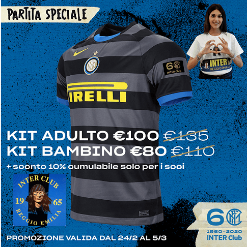 Non da ultimo, il kit terza maglia con patch Inter Club e pantaloncino sarà in promozione da oggi fino al 5 Marzo, con un super sconto solo per i soci IC attivi, al prezzo di €100 (invece che €135) per il kit adulto e di €80 (invece che €110) per quello junior. In aggiunta a questi prezzi vantaggiosi, ogni socio potrà usufruire di un ulteriore 10% di sconto cumulabile, inserendo la propria tessera Inter Club.
