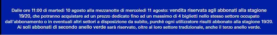 Fino alla mezzanotte di mercoledì 11 agosto potranno acquistare fino a 4 biglietti, purché tutti gli utilizzatori risultino abbonati alla stagione 2019-20.