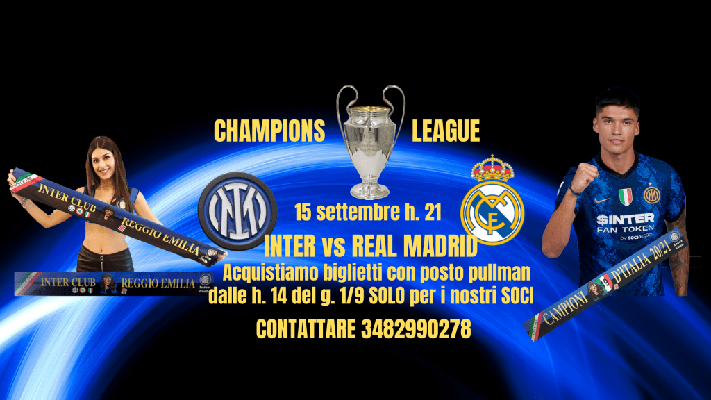 Di seguito tutte le info utili per l’accesso allo stadio e per l’acquistoTRAMITE IL NOSTRO CLUB dei biglietti validi per la gara dI CHAMPIONS LEAGUE 1^ giornata gruppo D Inter vs Real Madrid, in programma il prossimo mercoledì 15 Settembre a San Siro ore 21, con la prenotazione dei posti sul pullman organizzato per l’occasione. Occorre CONTATTARE IL N. 3482990278 con messaggio whatsapp o sms (soltanto dopo le h. 18 telefonando direttamente).