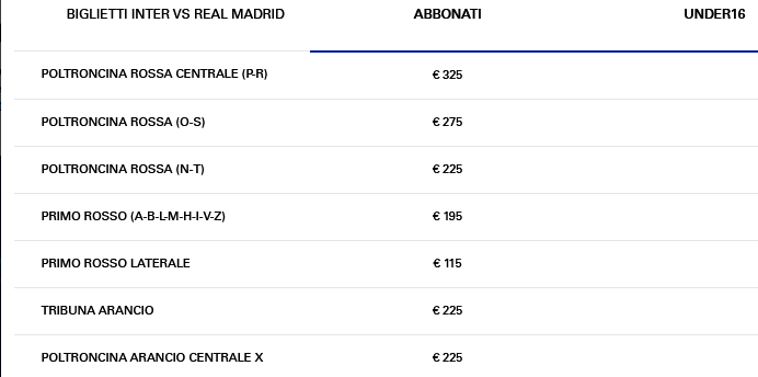 INTER-REAL MADRID: LISTINO PREZZI BIGLIETTI IN VENDITA