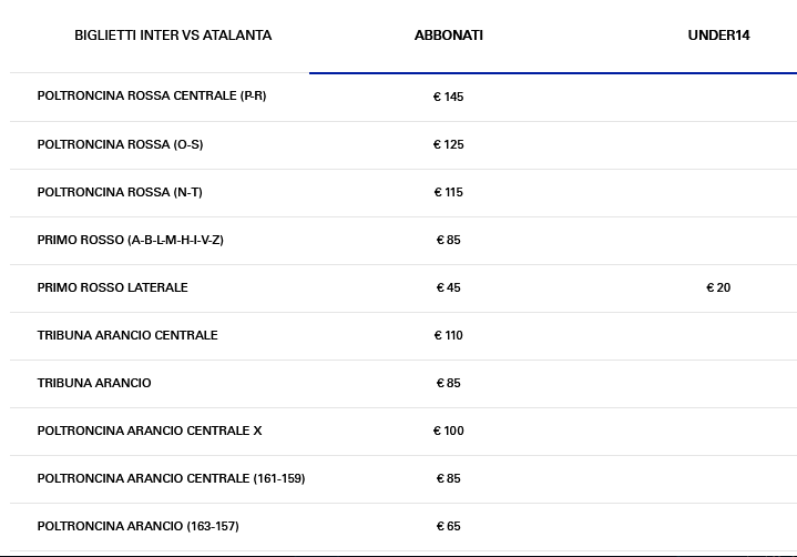 LISTINO PREZZI INTER vs ATALANTA (in prelazione ABBONATI 2019/20 )