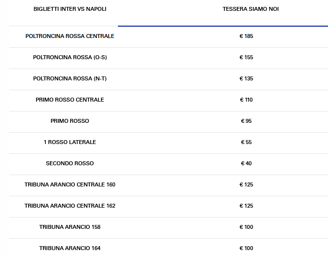 LISTINO PREZZI INTER vs NAPOLI VENDITA LIBERA