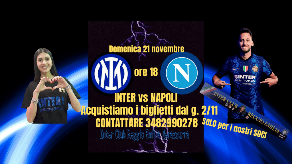 Di seguito tutte le info utili ai nostri SOCI per l’accesso allo stadio e per l’acquistoTRAMITE IL NOSTRO CLUB dei biglietti validi per la gara di campionato Inter vs Napoli, in programma domenica 21 novembre h. 18 a San Siro con la possibilità di prenotazione dei posti sul pullman organizzato per l’occasione. Occorre CONTATTARE IL N. 3482990278 con messaggio whatsapp o sms (soltanto dopo le h. 18 telefonando direttamente). Il servizio di acquisto biglietti delle partite è riservato SOLO AI NOSTRI SOCI.