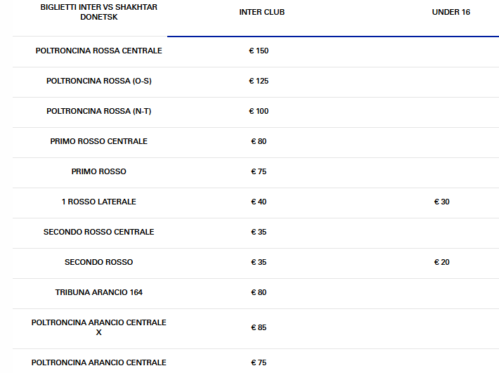 LISTINO PREZZI INTER vs SHAKHTAR PRELAZIONE SOCI INTER CLUB