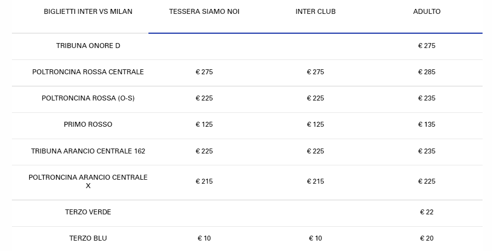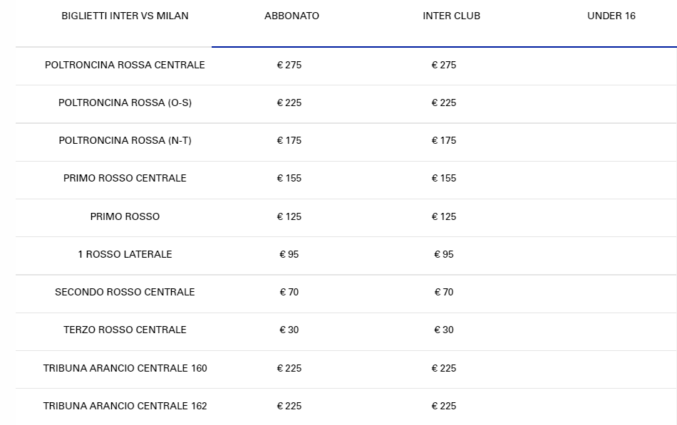 Listino prezzi Inter vs Milan FASE 1 abbonati 2019/20 (Terminata)