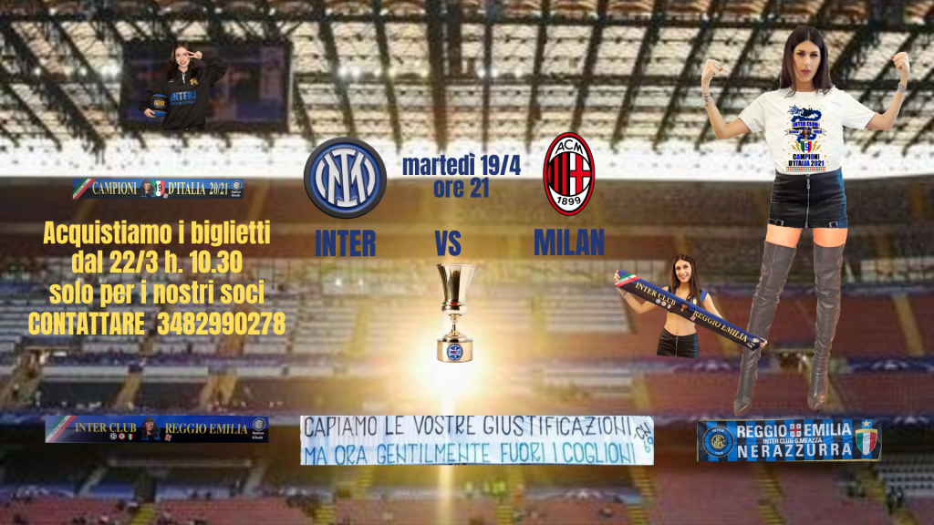 Di seguito le info per i nostri SOCI delle fase di vendita e dei relativi listini prezzi per l’acquisto, TRAMITE IL NOSTRO CLUB, dei biglietti per la partita Inter-Milan, gara di ritorno della semifinale di Coppa Italia, in programma martedì 19 aprile ore 21 a San Siro.