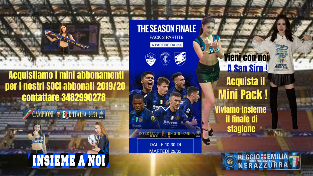 Grazie alla Promo di F.C. Internazionale, infatti, i nostri SOCI abbonati alla stagione 2019/2020 hanno la possibilità di sottoscrivere un Mini-Abbonamento per le ultime tre partite casalinghe dell’Inter, del campionato in corso, e di vivere il finale di stagione da protagonisti sugli spalti di San Siro. Le partite comprese nel Mini-Pack sono Inter-Roma, Inter-Empoli, Inter-Sampdoria.