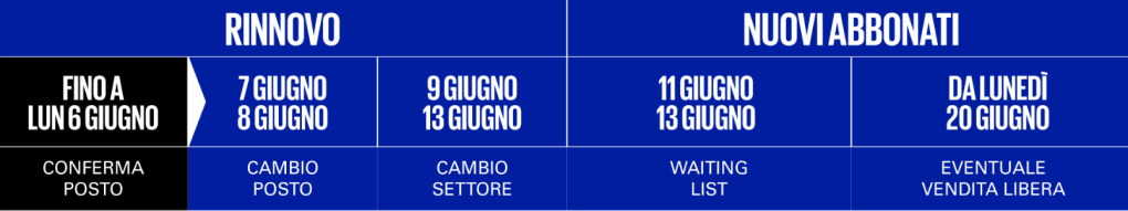 - FASE 3 – VENDITA RISERVATA – Da giovedì 9 a lunedì 13 giugno : per i nostri SOCI abbonati 2019/20 che non ci hanno precedentemente richiesto di acquistare e confermare il posto nella prima fase di vendita, potremo acquistare l’abbonamento in un posto di quelli rimasti liberi in qualsiasi settore disponibile. Nei primi due giorni potremo acquistare esclusivamente per i nostri SOCI abbonati 2019/20, mentre da sabato 11 a lunedì 13 potremo procedere all’acquisto anche per i nostri SOCI ISCRITTI alla WAITING LIST.