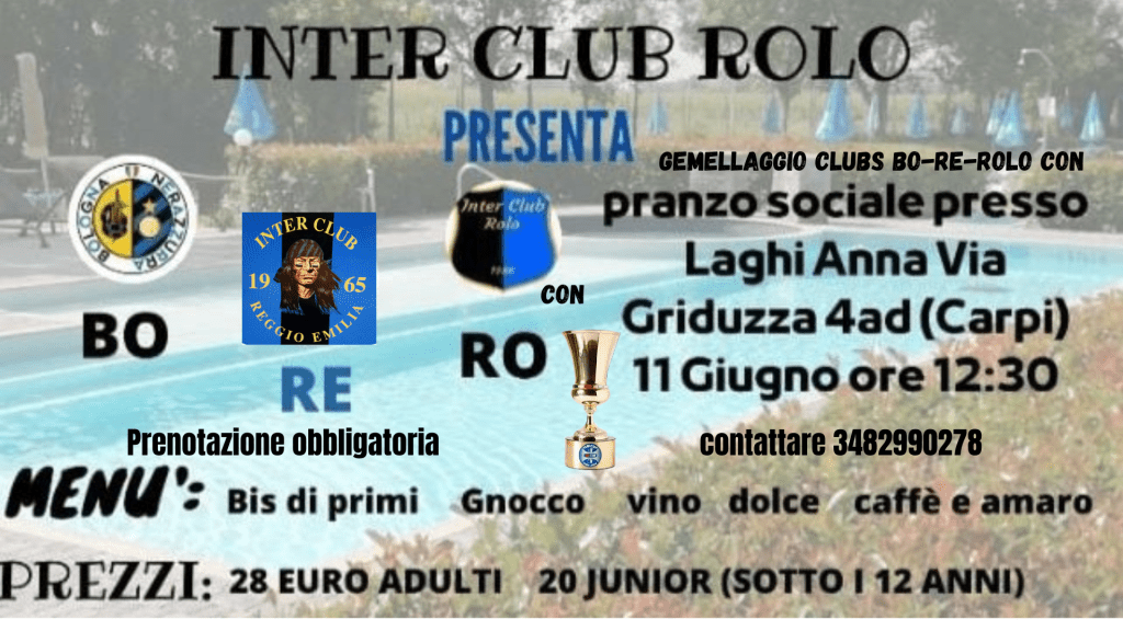 Invitiamo tutti i SOCI di Inter Club Reggio Emilia e i simpatizzanti interisti reggiani alla FESTA organizzata da I.C. Rolo che siglerà il GEMELLAGGIO tra I.C. Reggio Emilia, I.C. Rolo e I.C. Bologna Nerazzurra.