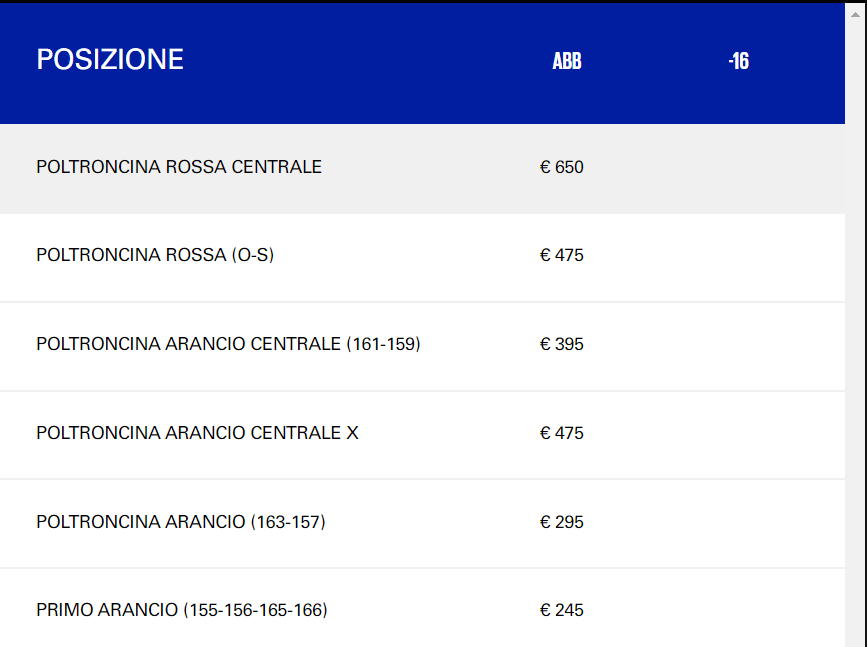 Per i SOCI abbonati in Tribuna Arancio Centrale 160/162 -> Tribuna Arancio 158/164