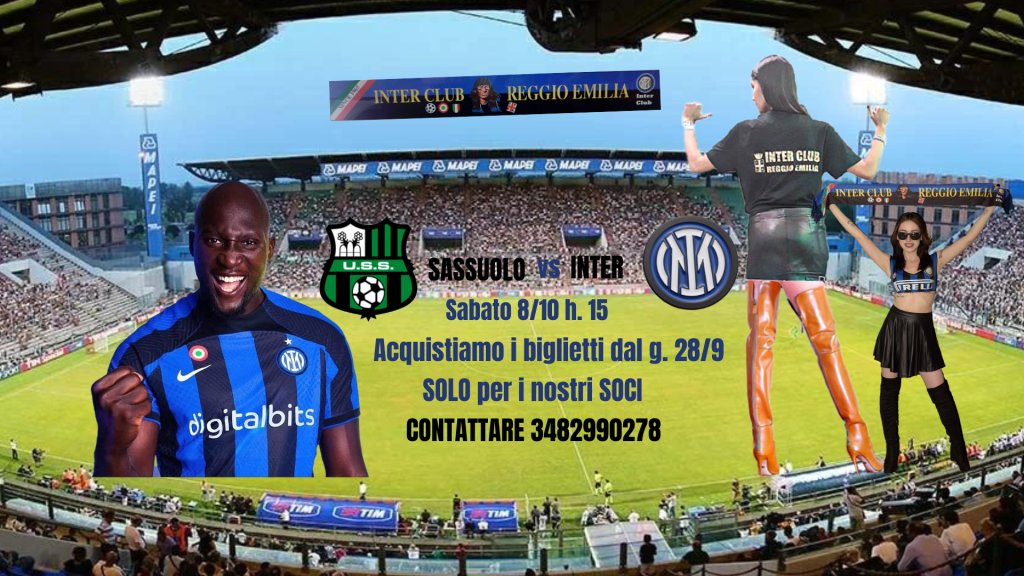 Di seguito tutte le info utili per I NOSTRI SOCI relative all’accesso allo stadio e all’acquisto, TRAMITE IL NOSTRO CLUB, dei biglietti validi per la gara di campionato SASSUOLO vs INTER in programma sabato 8 ottobre h. 15 al Mapei Stadium di Reggio Emilia. I nostri SOCI interessati a richiedere i biglietti al Club DEVONO CONTATTARE IL N. 3482990278 con messaggio whatsapp o sms (soltanto dopo le h. 18 telefonando direttamente).