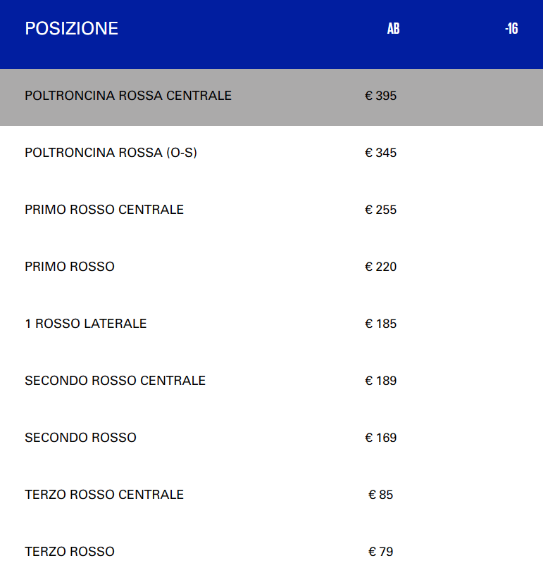 N. B. : IL LISTINO PREZZI (per ora riferito ai prezzi di Inter-Juventus della scorsa stagione in quanto FC Internazionale renderà disponibile il nuovo listino solo al momento dell’apertura della vendita dei biglietti. Riportiamo il vecchio per dare ai nostri soci un’idea dei prezzi che, probabilmente, subiranno un aumento) E’ RIPORTATO DOPO LE FASI DI VENDITA.