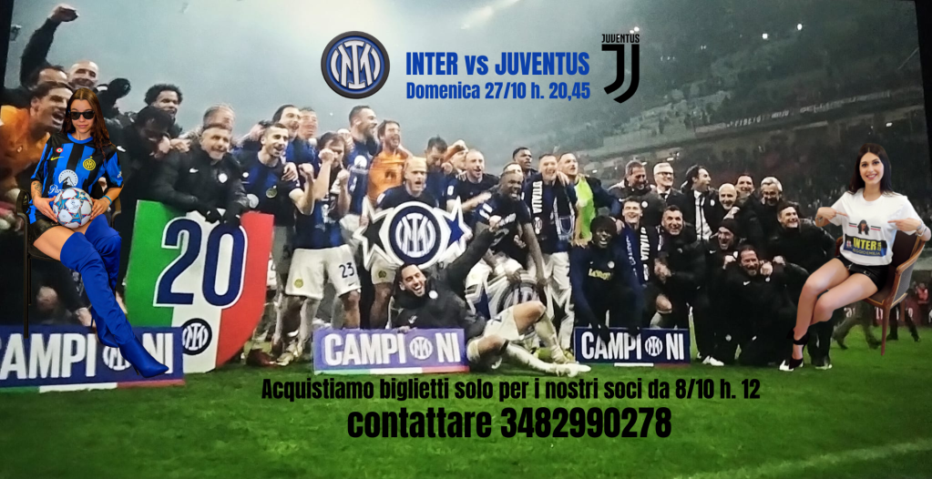 Per acquistare il biglietto di INTER-JUVENTUS tramite il nostro club e prenotare il posto pullman i nostri SOCI DEVONO CONTATTARE IL N. 3482990278 con messaggio whatsapp o sms (soltanto dopo le h. 18,30 telefonando direttamente).
