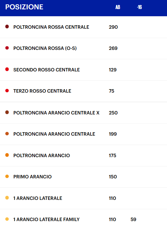 N. B. : Il listino prezzi “conferma posto abbonati” é riportato di seguito dopo le fasi di vendita.