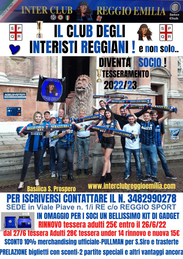 E’ altresì possibile iscriversi presso la nostra Sede in Viale Piave n. 1/i presso REGGIO SPORT a Reggio Emilia (chiedere di Davide – chiuso il giovedì pomeriggio). Ai soci dell’Inter Club Reggio Emilia oltre alla tessera (che comporta i tanti e importanti vantaggi sopra indicati) verrà consegnato il “Kit” ufficiale con i gadgets sopra riportato nella locandina.