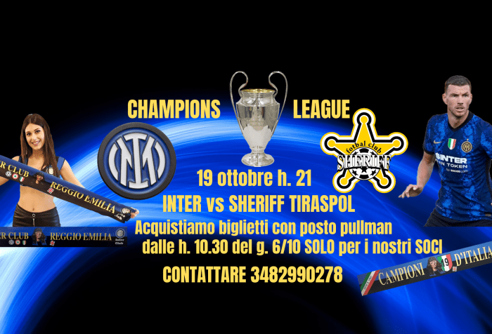 INTER VS SHERIFF TIRASPOL INFO ACQUISTO BIGLIETTI PER CONTO DEI NOSTRI SOCI E PULLMAN Di seguito tutte le info utili per l’accesso allo stadio e per l’acquistoTRAMITE IL NOSTRO CLUB … Continua la lettura di INTER-SHERIFF