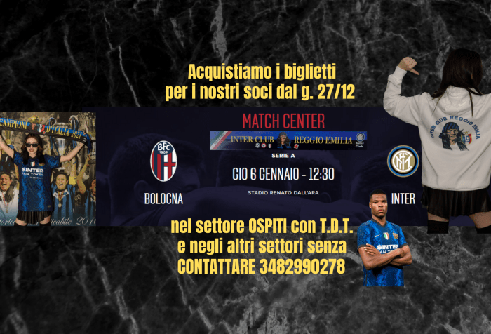 Di seguito il listino prezzi per i nostri SOCI per l’acquisto, TRAMITE IL NOSTRO CLUB, dei biglietti validi per la gara di campionato Bologna vs Inter in programma giovedì 6 … Continua la lettura di Bologna-Inter