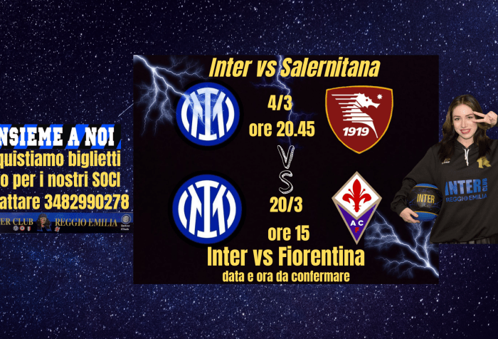 Di seguito le info per i nostri SOCI delle fase di vendita e dei relativi listini prezzi per l’acquisto, TRAMITE IL NOSTRO CLUB, dei biglietti per Inter-Salernitana, gara in programma Venerdì … Continua la lettura di Two matches