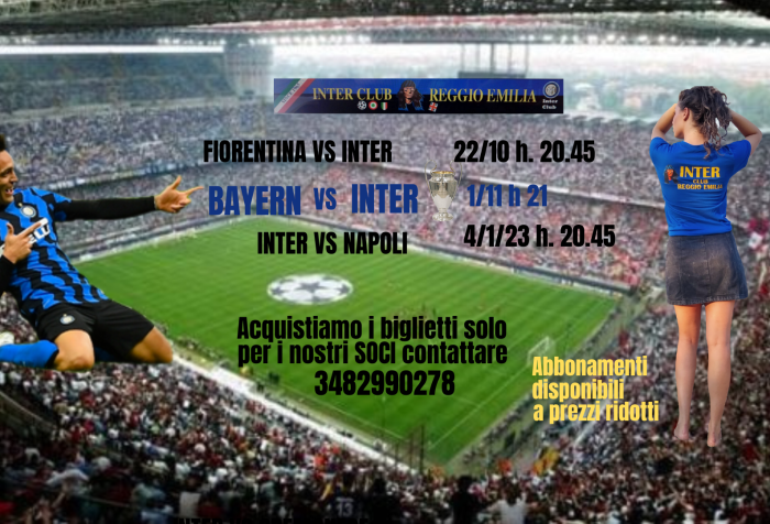 Comunichiamo le INFO disponibili riguardanti la VENDITA BIGLIETTI delle 3 gare dell’Inter di campionato e Champions League 2022/23 riportate nella locandina sopra pubblicata. Per acquistare il biglietto di ogni match e … Continua la lettura di Bayern/Napoli/Viola